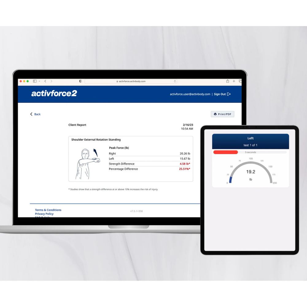Zintegrowany system ActivForce 2 łączy fizyczne urządzenie z cyfrowym pulpitem nawigacyjnym w celu pomiaru kluczowych danych dotyczących siły i ilościowego określania wyników w czasie rzeczywistym w fizjoterapii i rehabilitacji.