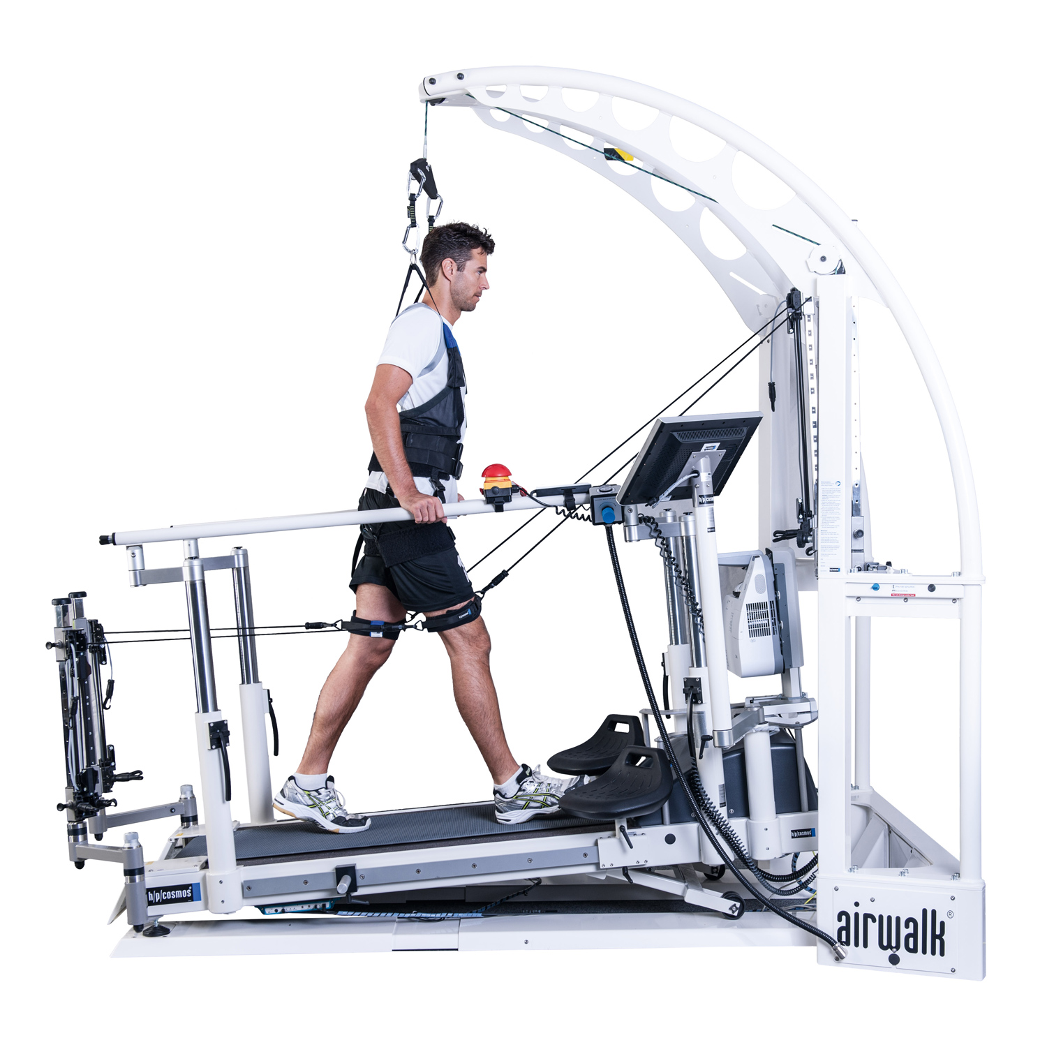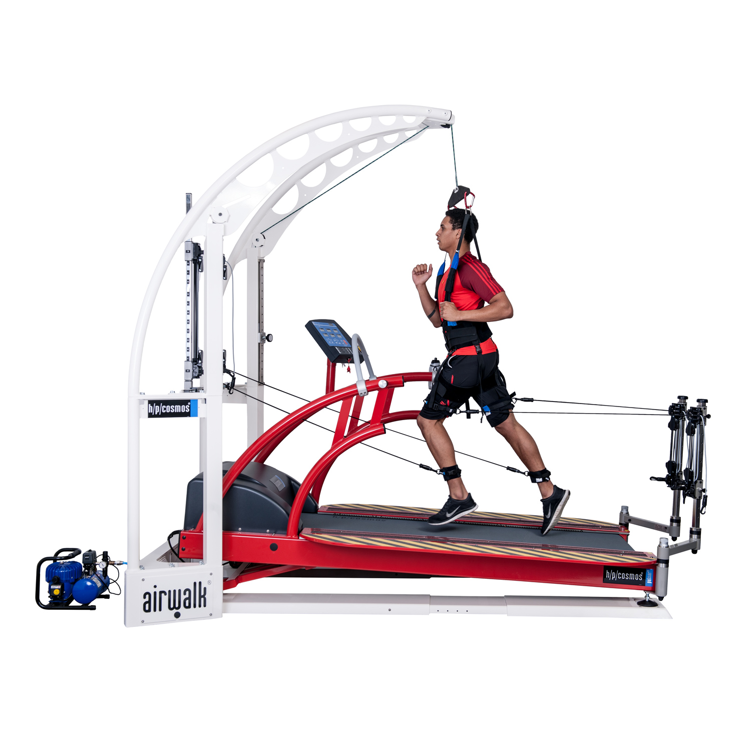 Moduł odciążenia h/p/cosmos airwalk to pneumatyczny system do pełnego odciążenia pacjenta podczas terapii na bieżni h/p/cosmos. W zależności od modelu, możliwe jest odciążenia masy ciała do 80 kg (standard) lub nawet 120/160/240 kg (opcja), co sprawia, że nie tylko możemy płynnie i precyzyjnie dopasowywać odciążenie pacjenta do jego potrzeb i bieżących możliwości, ale dzięki tak dużej regulacji – trenować w warunkach podobnych do zmniejszonej grawitacji – zwłaszcza w połączeniu z modułem ekspanderów wspomagających lub oporujących kończyny dolne.