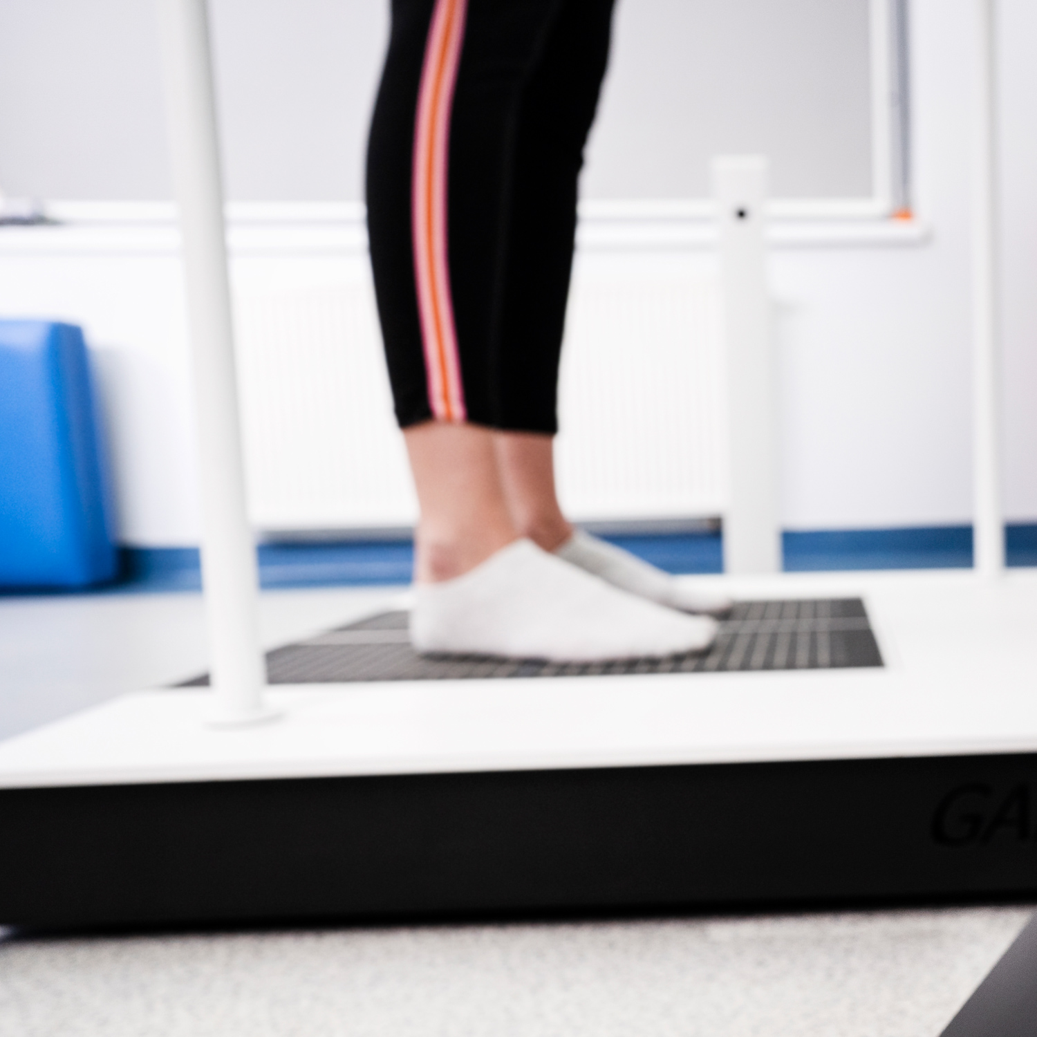 Widok boczny – pacjent stojący na platformie stabilometrycznej ALFA.