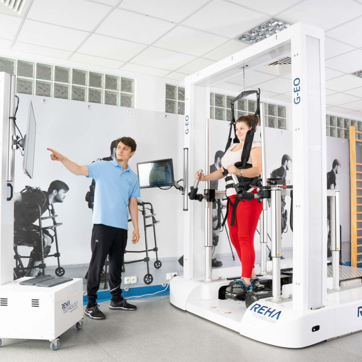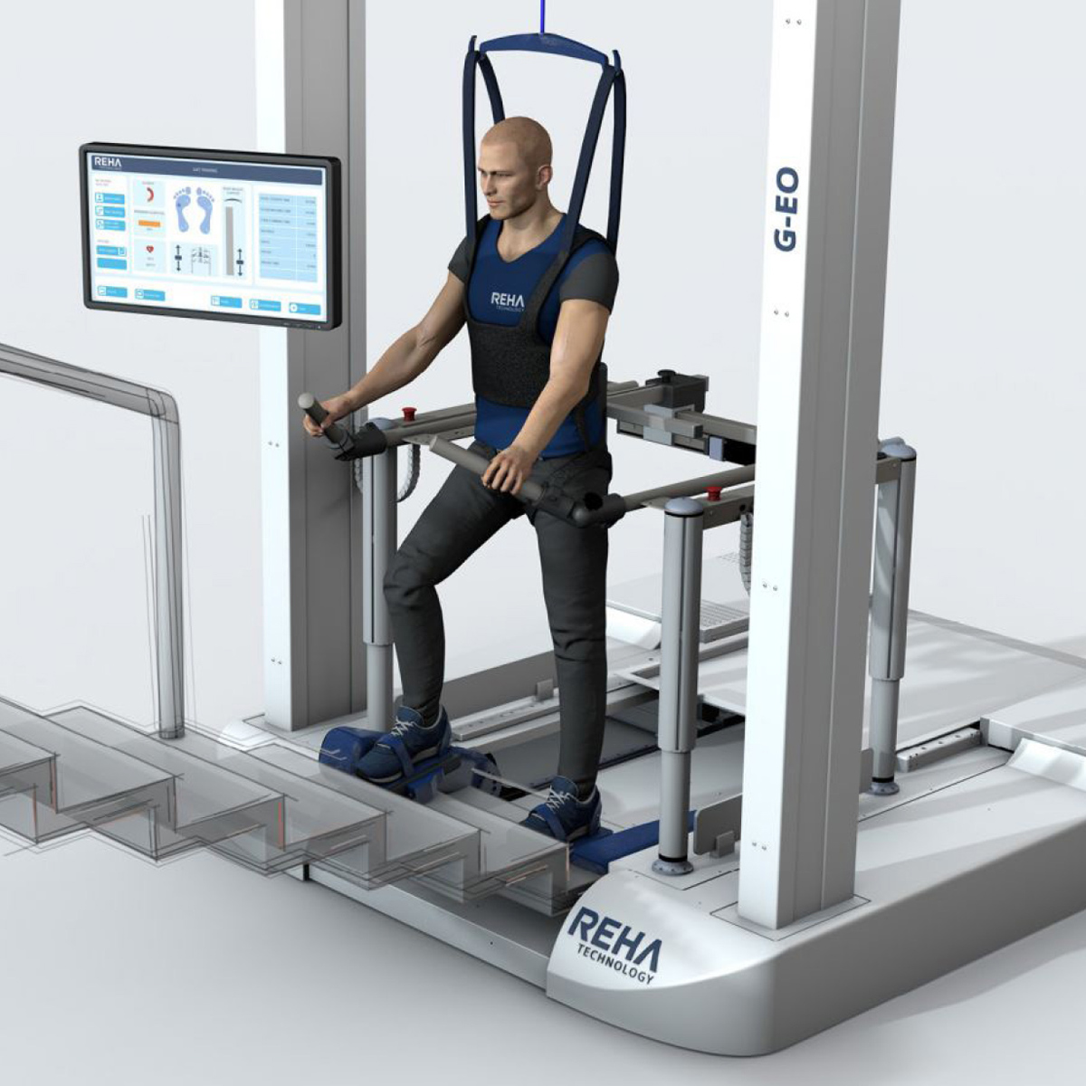Wykorzystując technologię „end-effector”(podstawy mocowane do kończyn dolnych pacjenta, w tym stóp) robot G-EO precyzyjnie odwzorowuje naturalne wzorce chodu. Dzięki takiemu rozwiązaniu proces wpinania i wypinania pacjenta jest niezwykle krótki, co pozwala na maksymalne wykorzystanie czasu w jednostce zabiegowej i wydłużenie faktycznego czasu trwania terapii. To zaawansowane rozwiązanie nie tylko wspomaga proces reedukacji chodu, ale także aktywuje i reorganizuje neuronalne obszary mózgu, odpowiedzialne za kontrolę i koordynację ruchów.