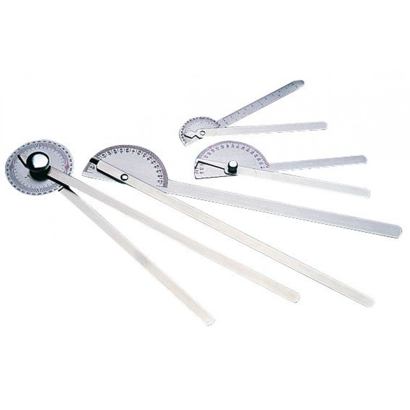długość 35 cm, zakres pomiaru 360°, podziałka pomiaru co 1°, dwie skale pomiaru, możliwość regulacji oporu ruchu ramion pomiarowych, możliwość zablokowania położenia ramion |