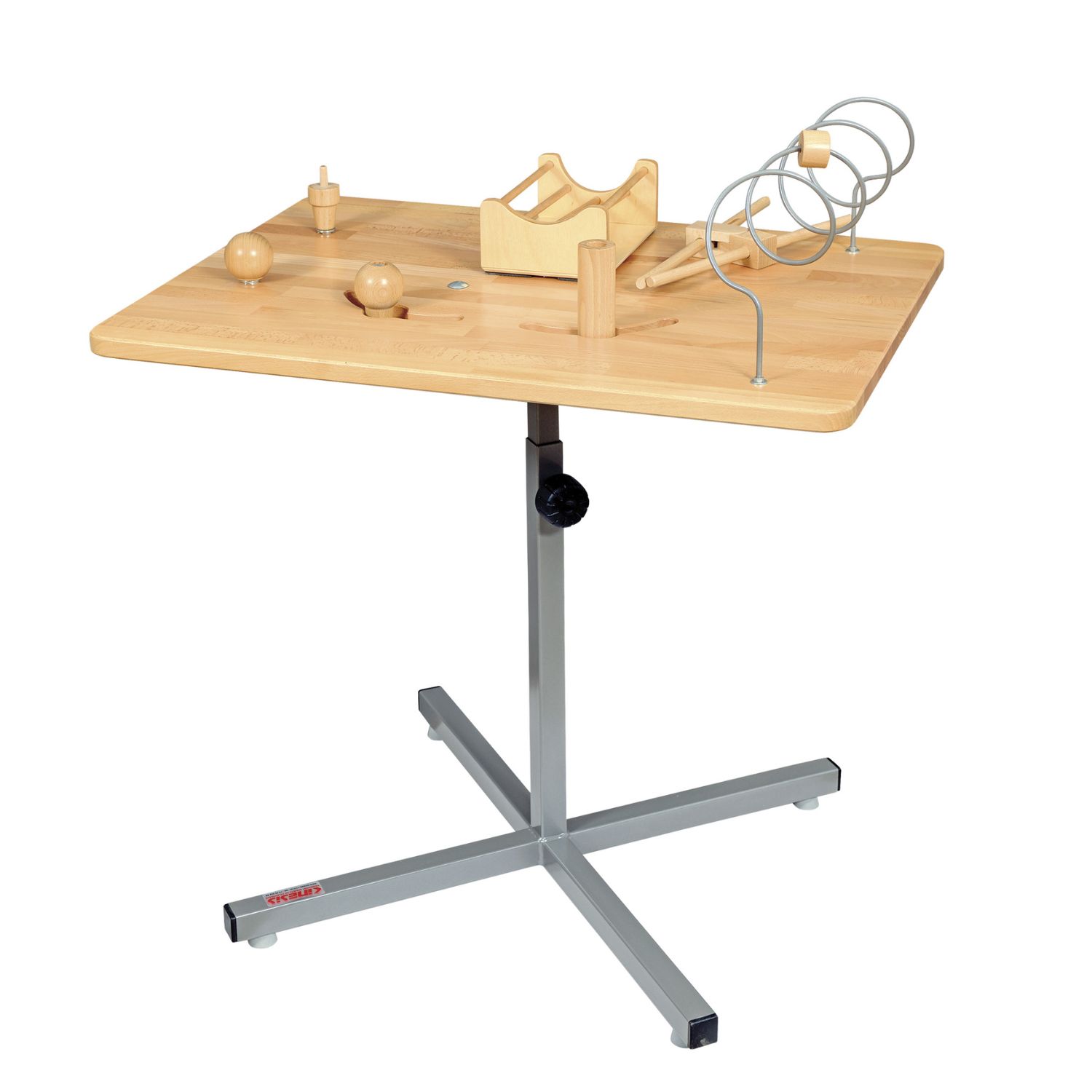 Tablice do ćwiczeń manualnych ręki - tablice przeznaczone są zarówno dla dorosłych jak i dla dzieci do ćwiczeń czynnych z/bez oporu. Zwiększają przede wszystkim ruchomość stawów oraz siłę mięśni dłoni i palców. Wyposażone są w zestaw przyrządów do ćwiczeń umocowanych na blacie o wymiarach 72 x 52 cm z możliwością regulacji wysokości.