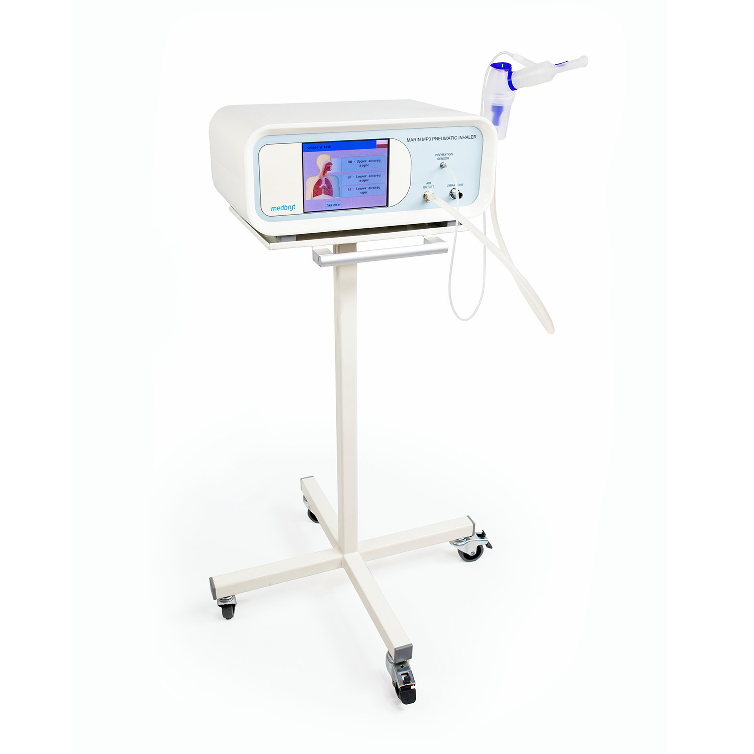 Marin MP3 – inhalator pneumatyczny z ekranem dotykowym i nebulizatorem.Marin MP3 – inhalator pneumatyczny na stojaku mobilnym z nebulizatorem.
