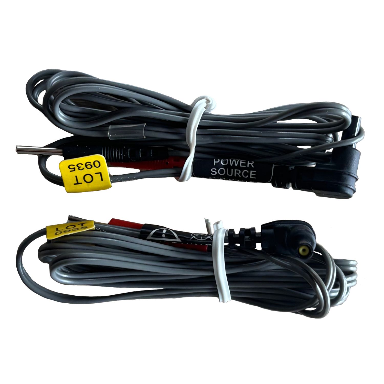 Przewód do aparatu TENS – komplet 2 sztuki, widok zwiniętego kabla z końcówkami.Kabel do elektrostymulatora TENS – końcówki czerwono-czarne z wtykiem kątowym.Przewód do TENS – rozłożony kabel z wtyczką i elektrodowymi końcówkami.Zestaw przewodów do aparatu TENS – komplet dwóch kabli w opakowaniu.