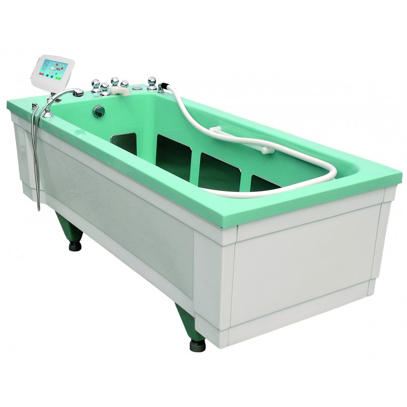 Wanna T-UWM/E przeznaczona jest do kąpieli elektryczno-wodnych oraz do masażu podwodnego. Zabieg można wykonać manualnie przy pomocy węża z trzem wymiennymi końcówkami (posiada możliwość płynnej regulacji ciśnienia w zakresie 0-5,5 bara) lub przy pomocy opcjonalnego systemu dysz. Parametry kontrolować można z poziomu dotykowego panelu sterowania – czas zabiegu, natężenie prądu, kierunek przepływu prąd, polaryzacja każdego z aplikatorów. Elektrody umieszczone na ścianach wanny wykonane są z wysokogatunkowej stali nierdzewnej. T-UWM/E możne generować prąd galwaniczny, diadynamiczny i faradyczny.