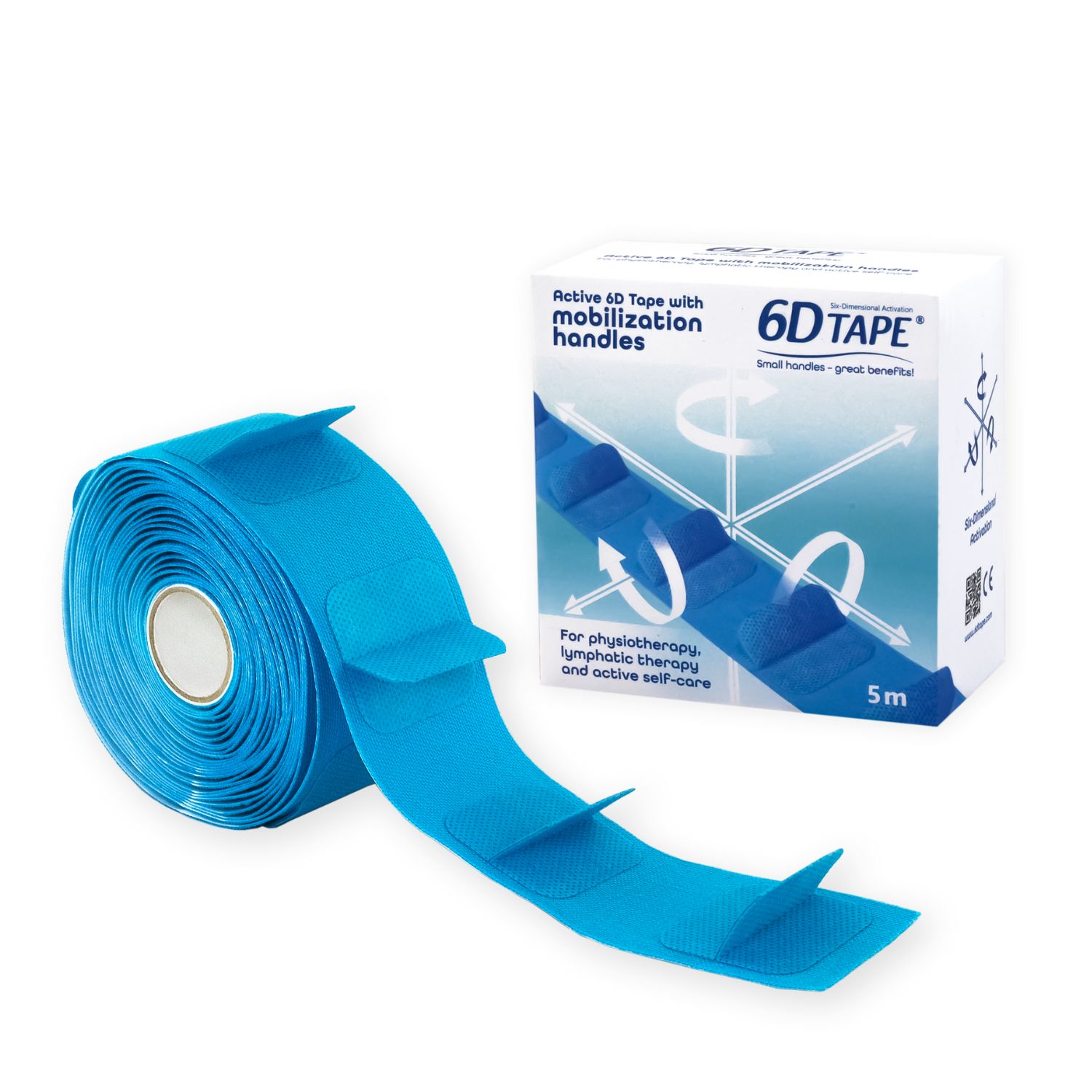 Taśma 6D – rolka 5 m, elastyczna taśma terapeutyczna z uchwytami mobilizacyjnymi.Taśma 6D – zwinięta rolka 5 m w kolorze niebieskim, do terapii manualnej i fizjoterapii.Taśma 6D – rolka 5 m widok z góry, taśma z uchwytami do mobilizacji tkanek.Taśma 6D – rozwinięty fragment taśmy z uchwytami, długość 5 m.